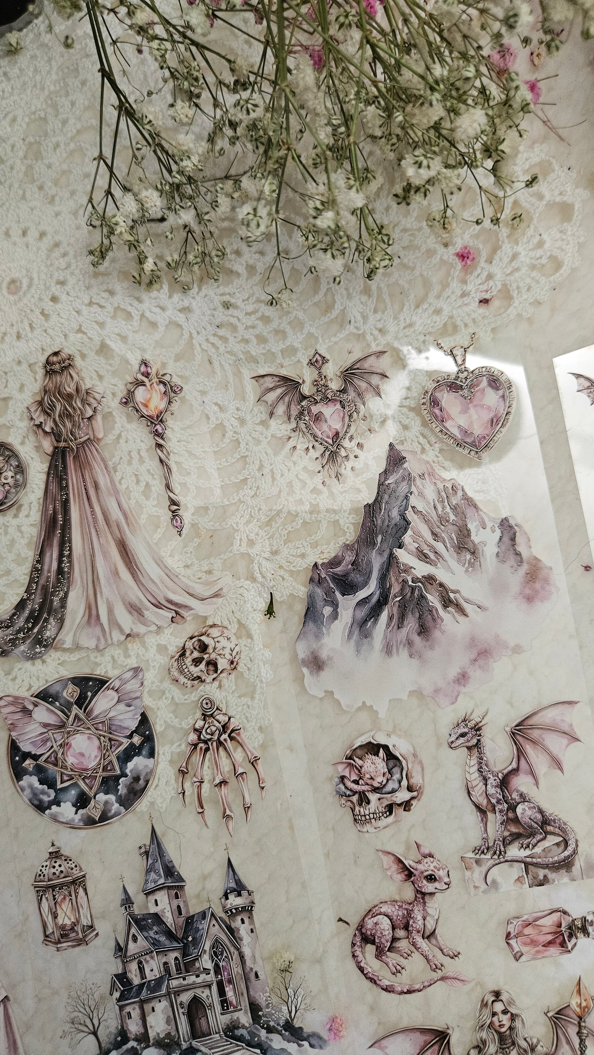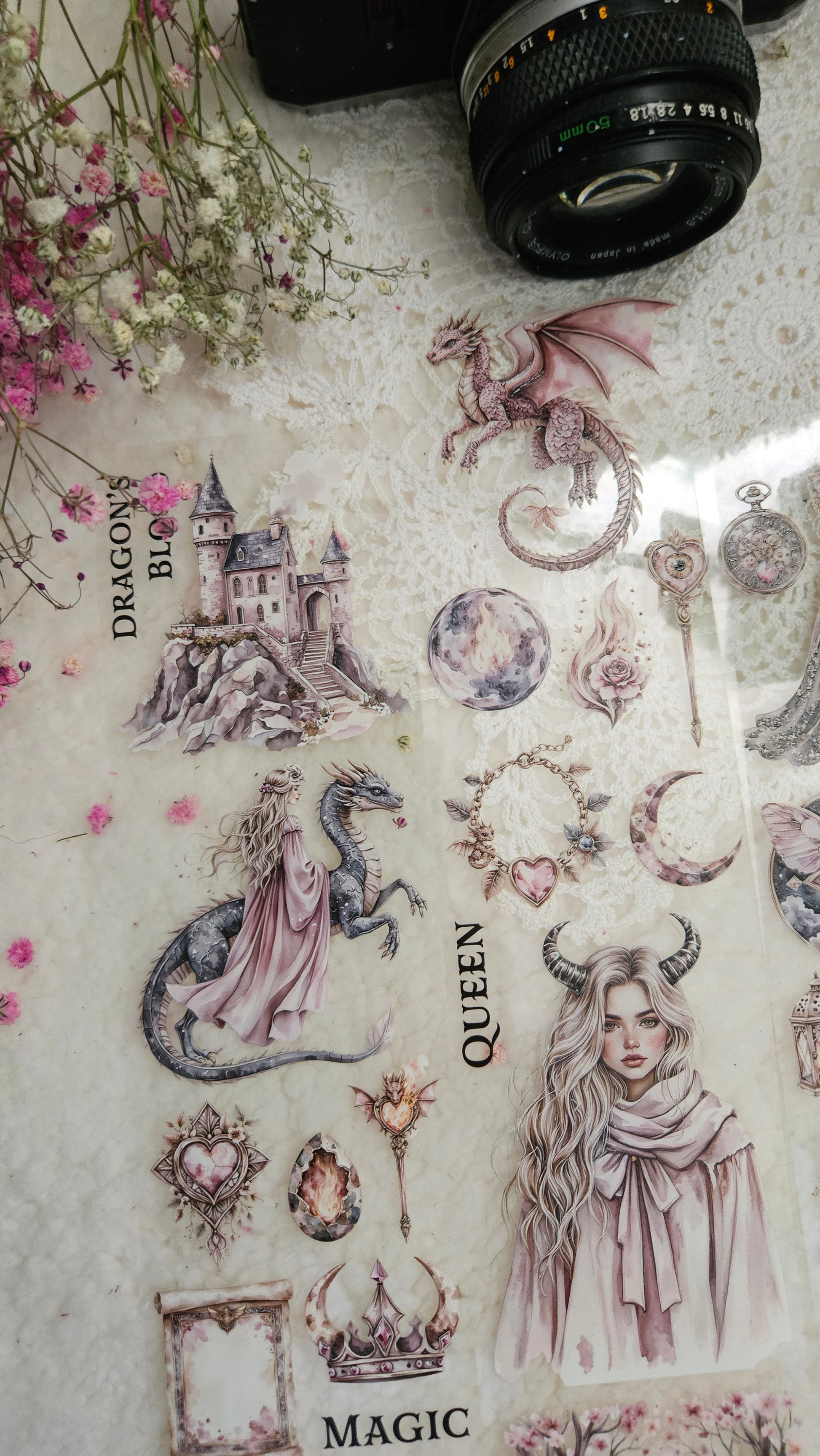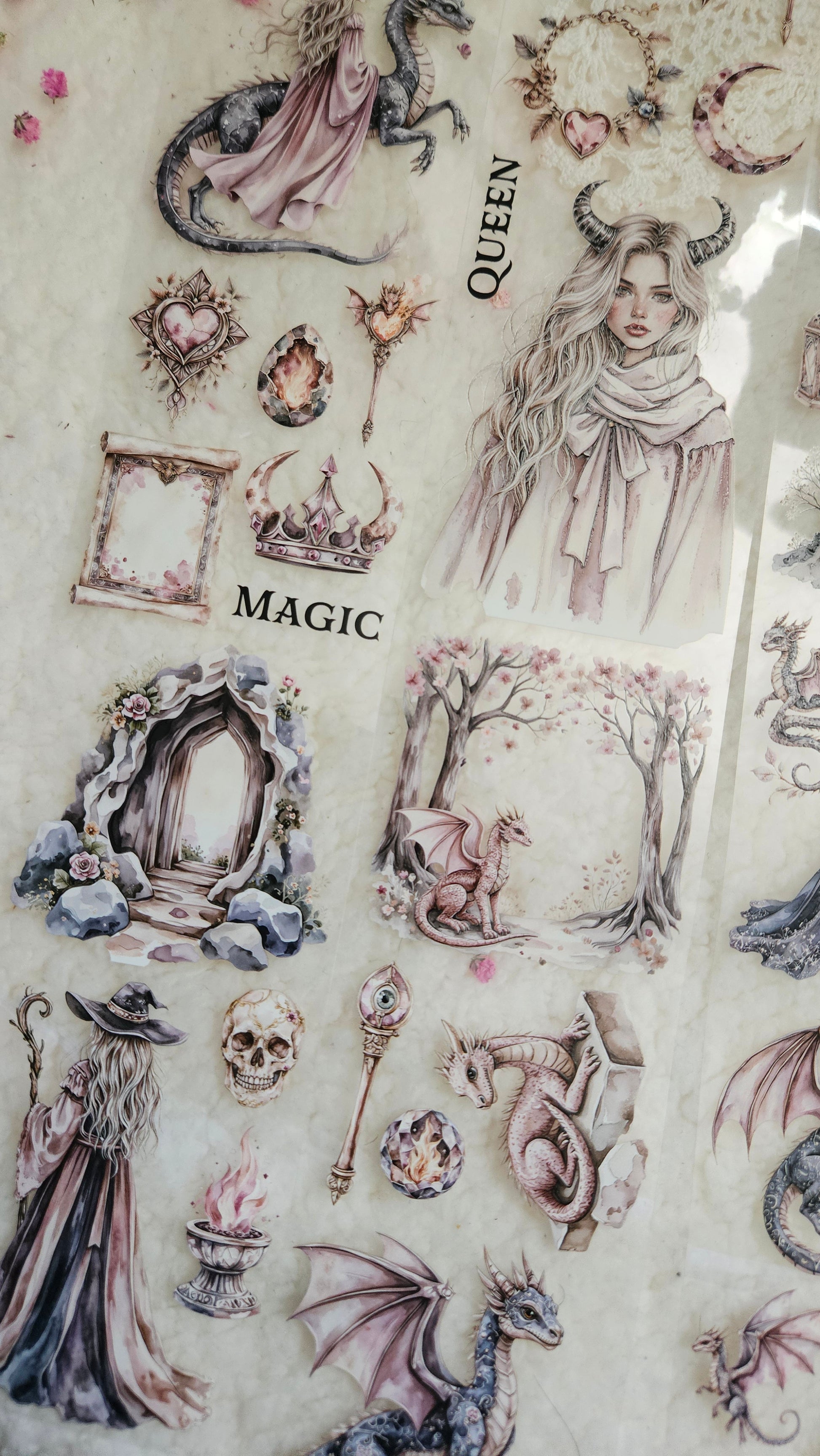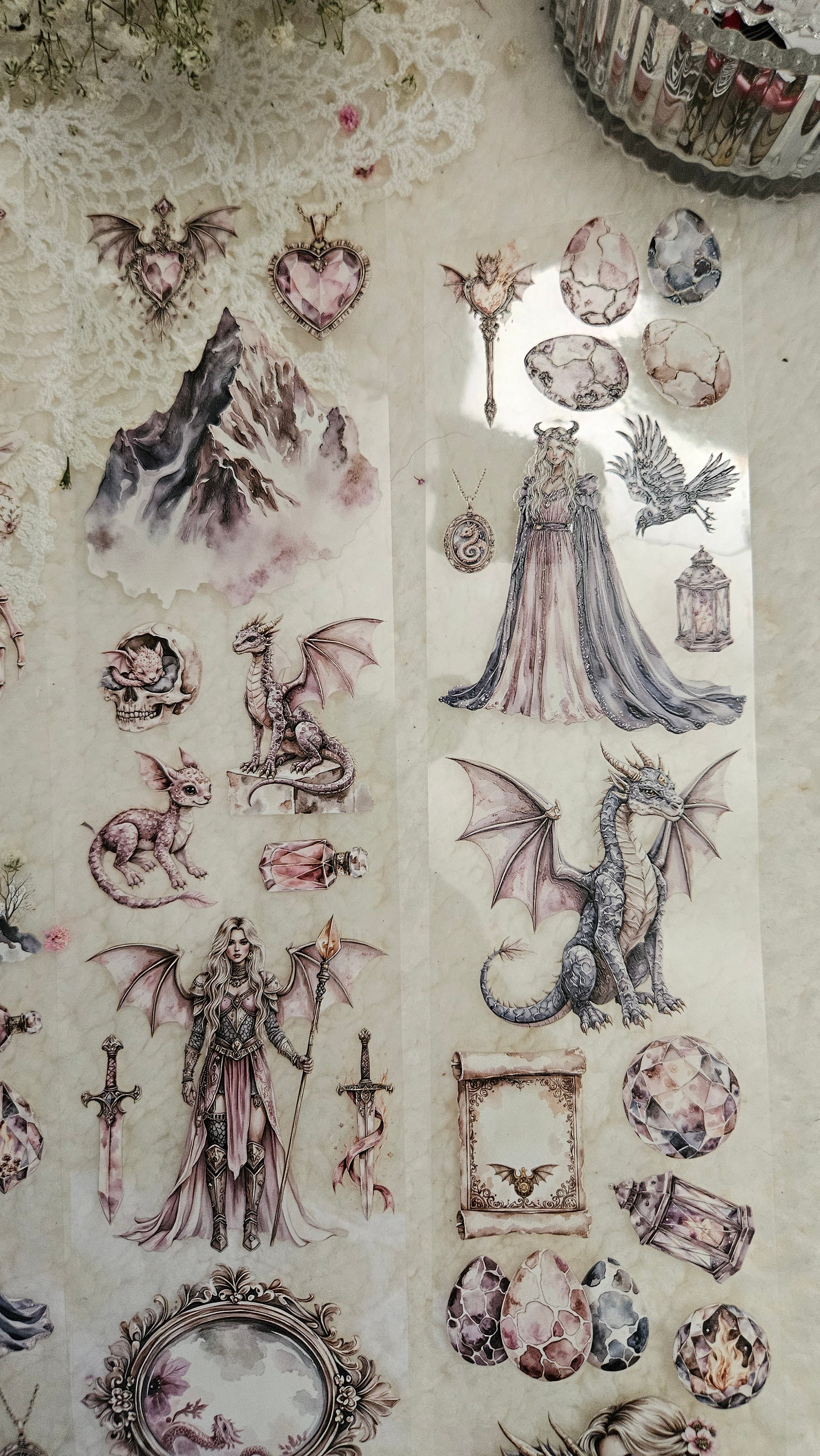 My decorated PET tapes are perfect for journaling but can be used in scrapbooking and other creative projects with extra glue support (glue tape for example). Made from high-quality clear or matte PET material, these tapes feature stunning illustrations created using AI technology (aven bought clipart), with crystal ink designs that add elegance and sparkle to any page. These tapes are a versatile tool to elevate your DIY crafts with ease and style.