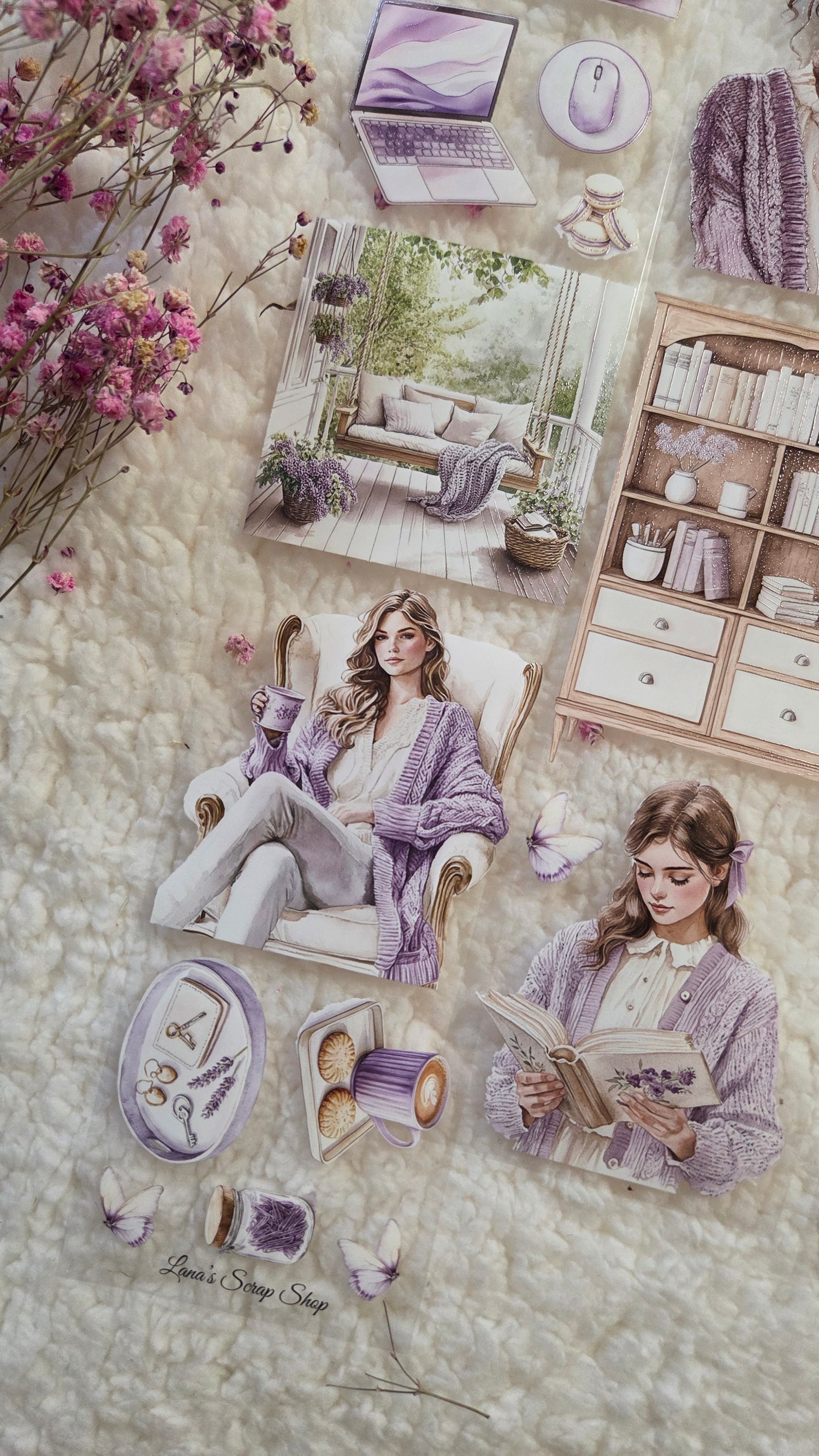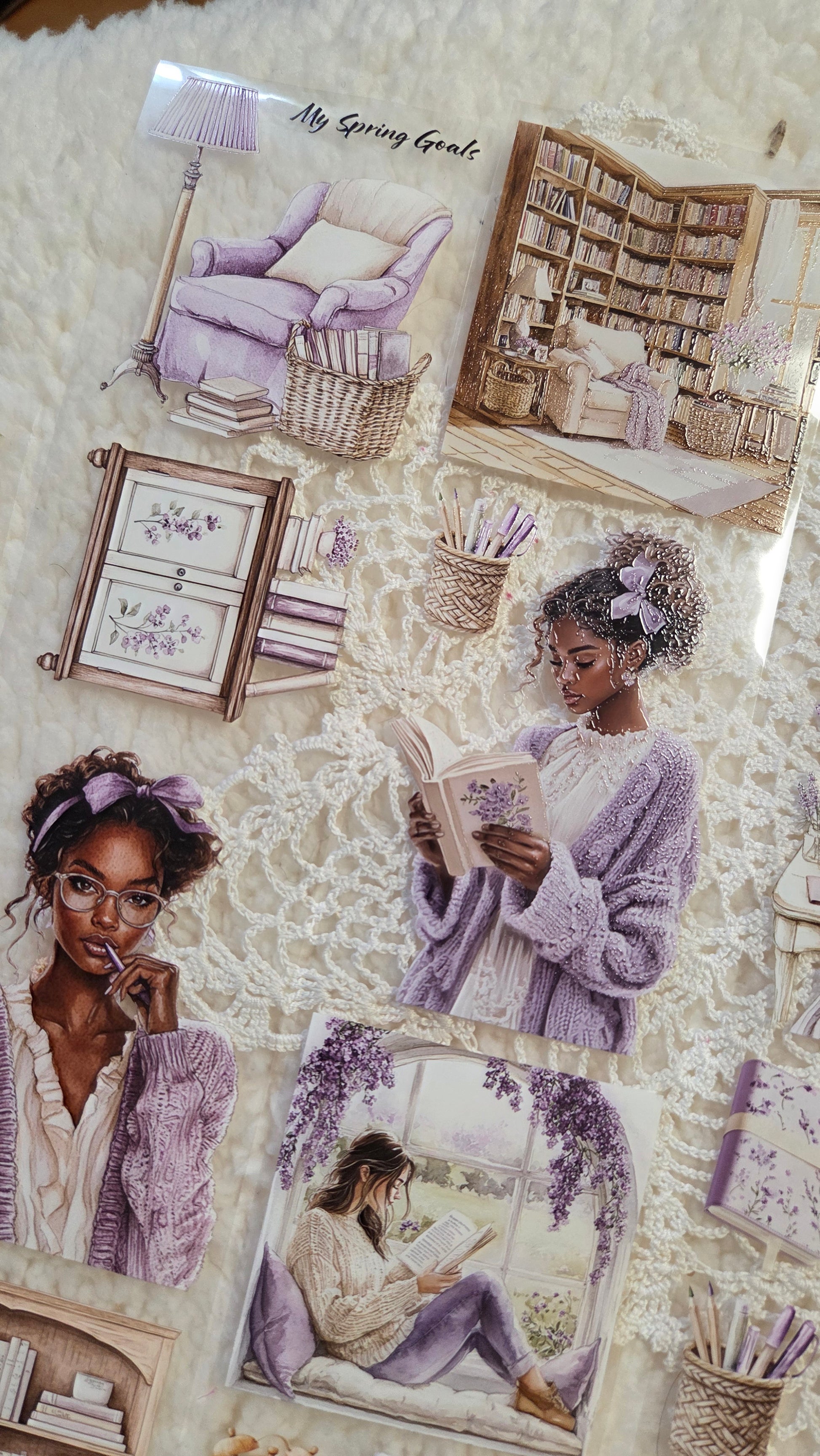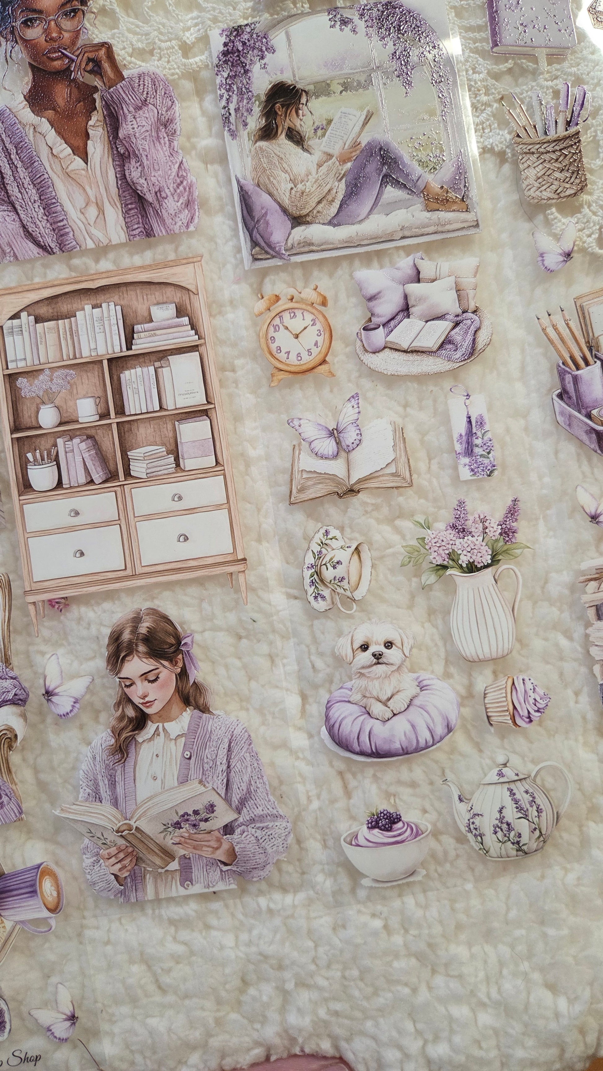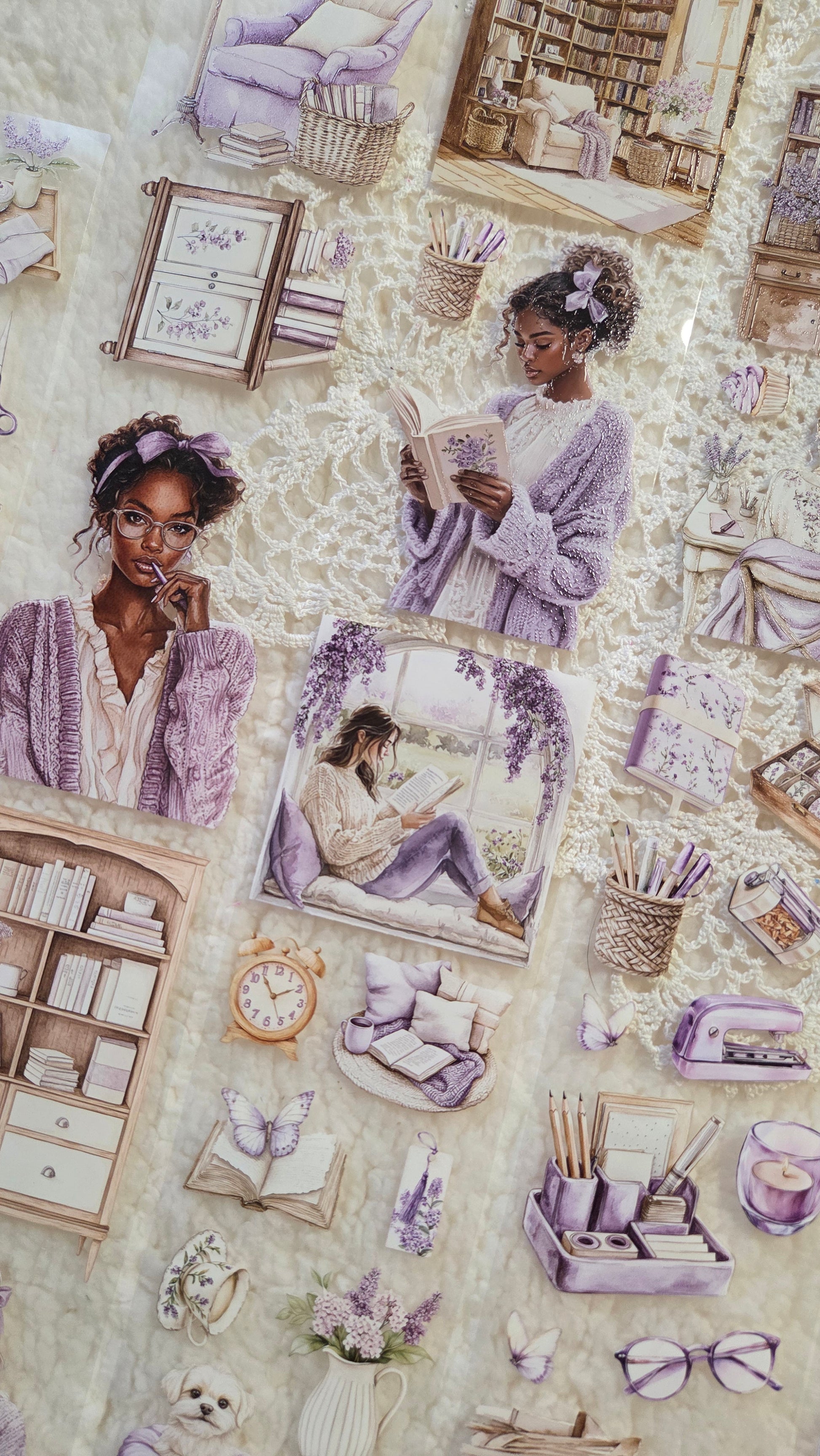 The design includes lavender accents, reading corners, planners, stationery items, and dreamy lifestyle illustrations.