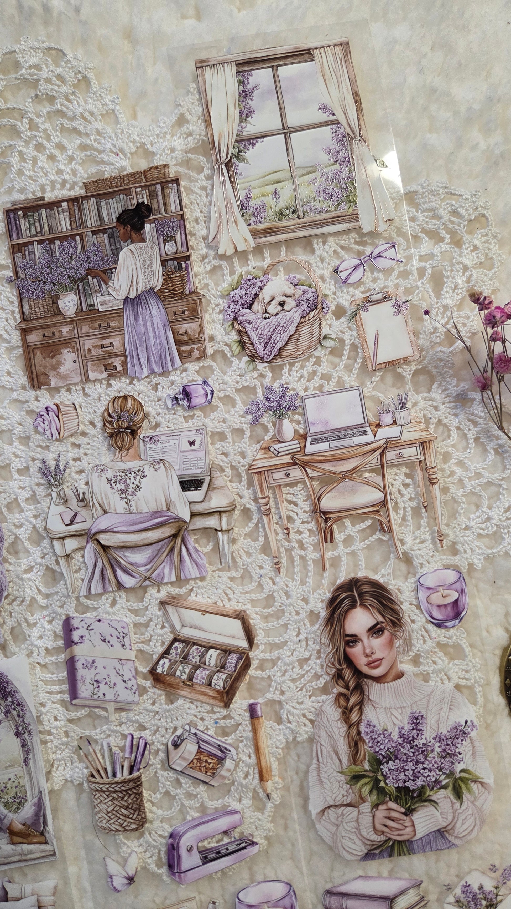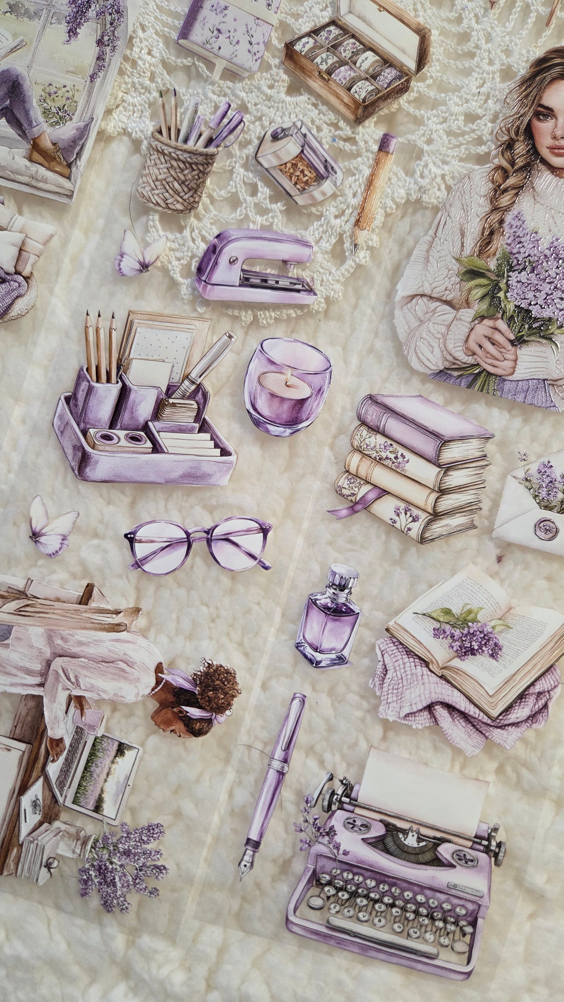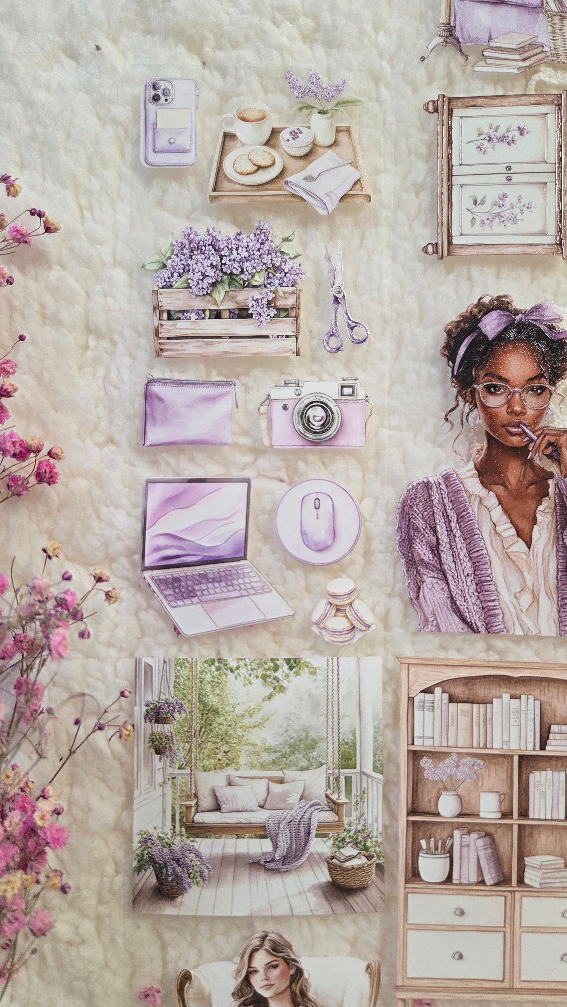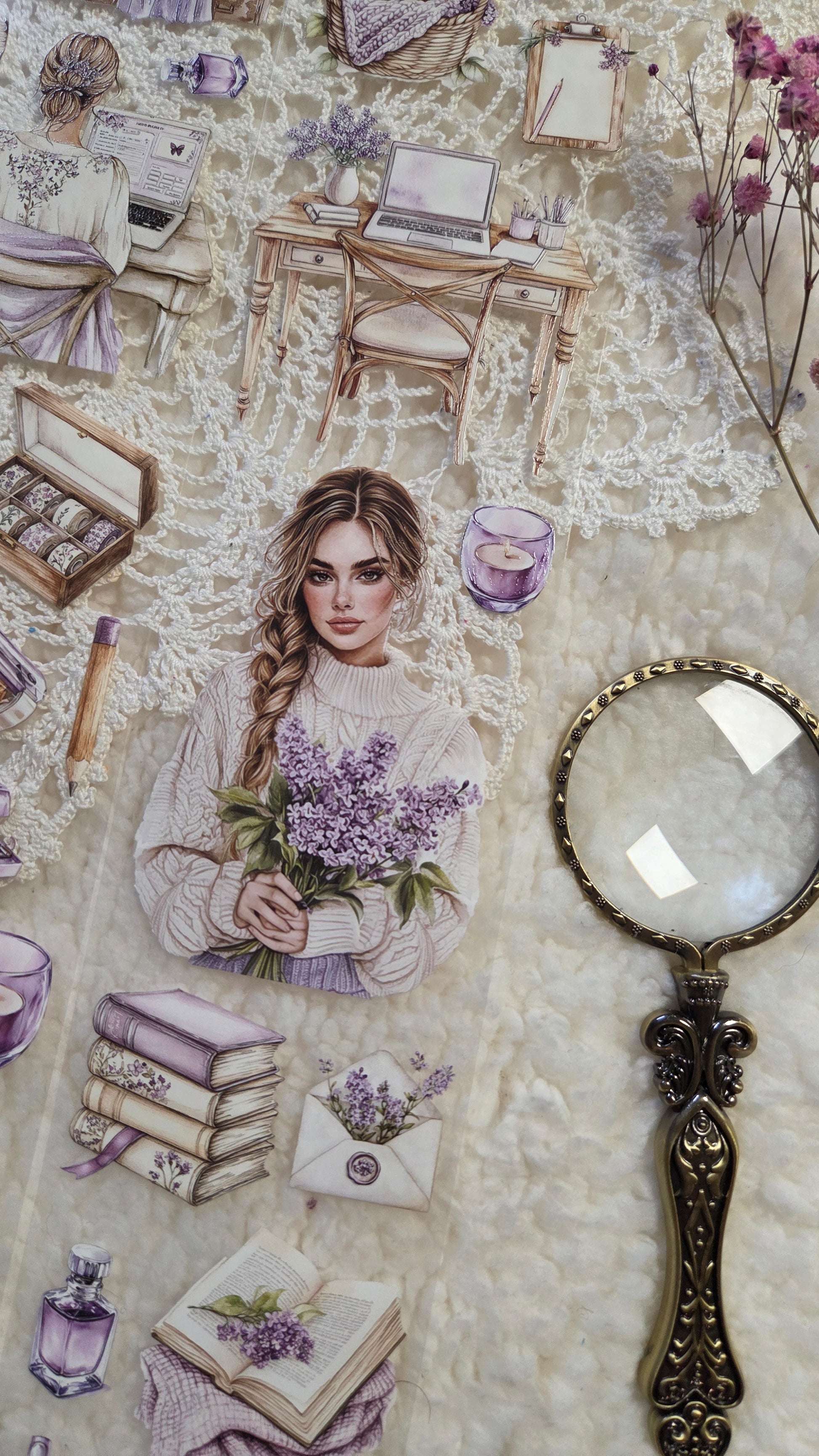 The design includes lavender accents, reading corners, planners, stationery items, and dreamy lifestyle illustrations.
