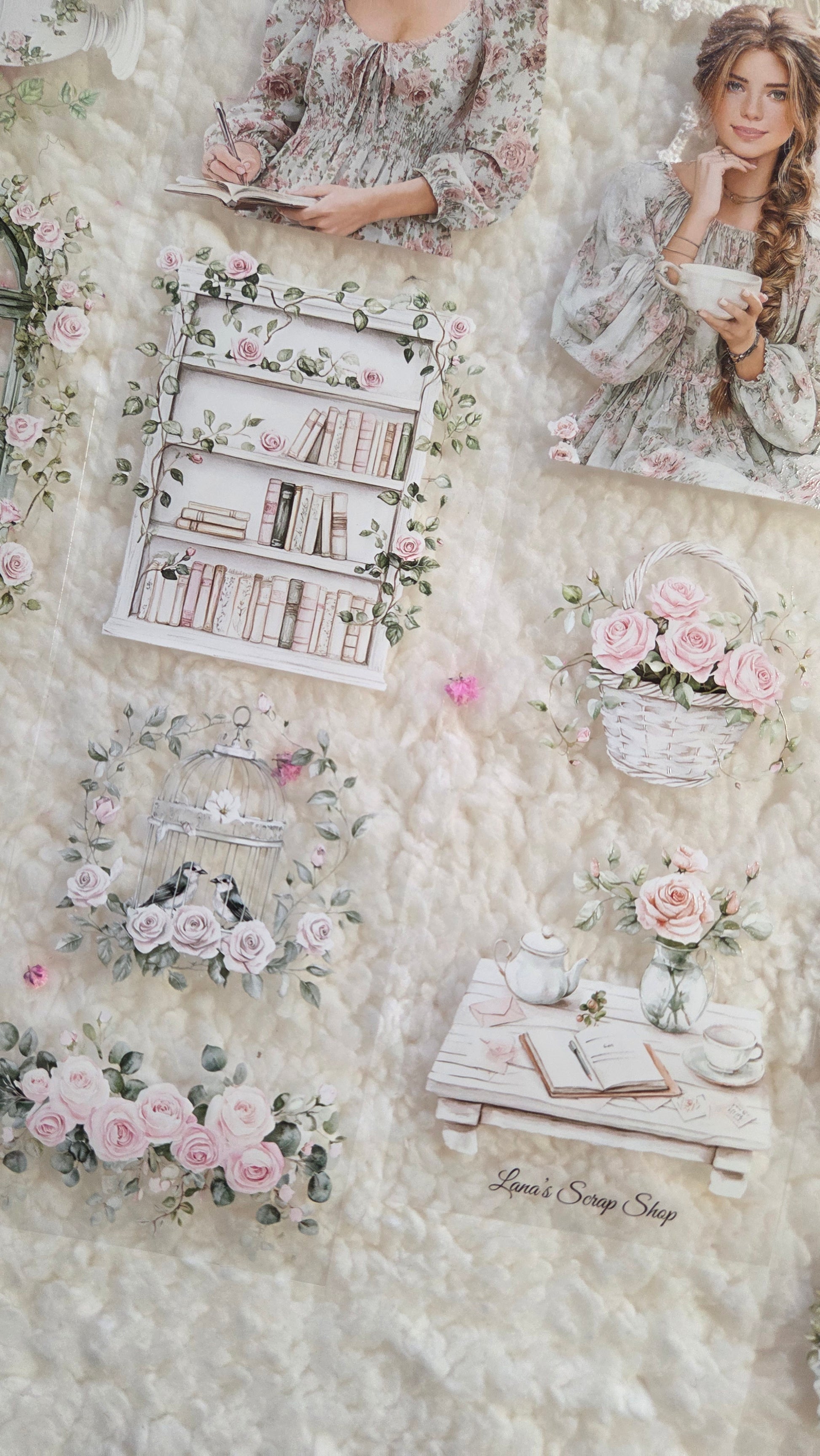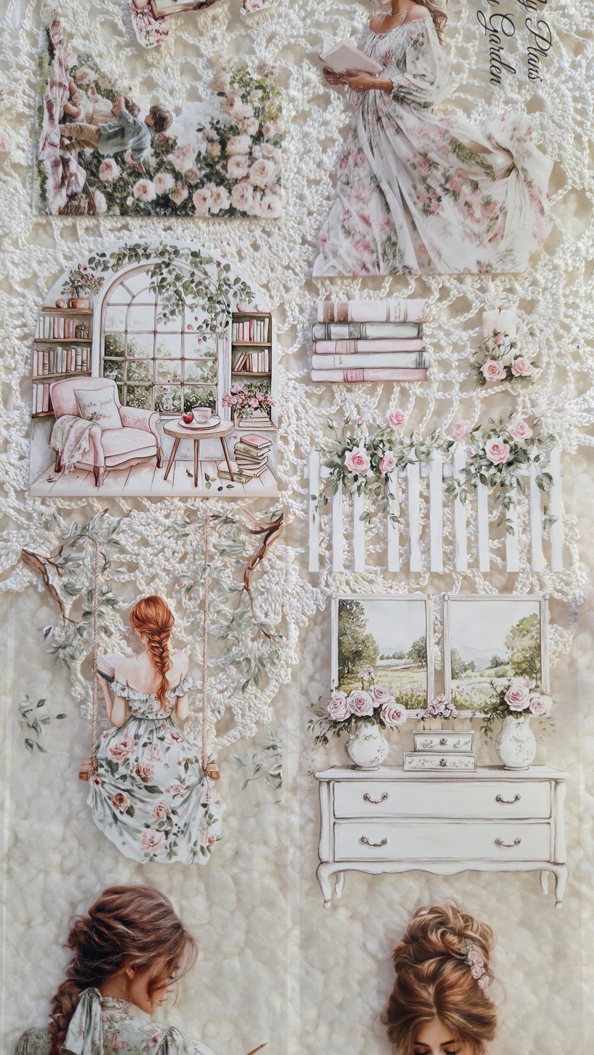 The illustrations feature blooming roses, garden doors, cozy interiors, and elegant characters enjoying quiet creative time.