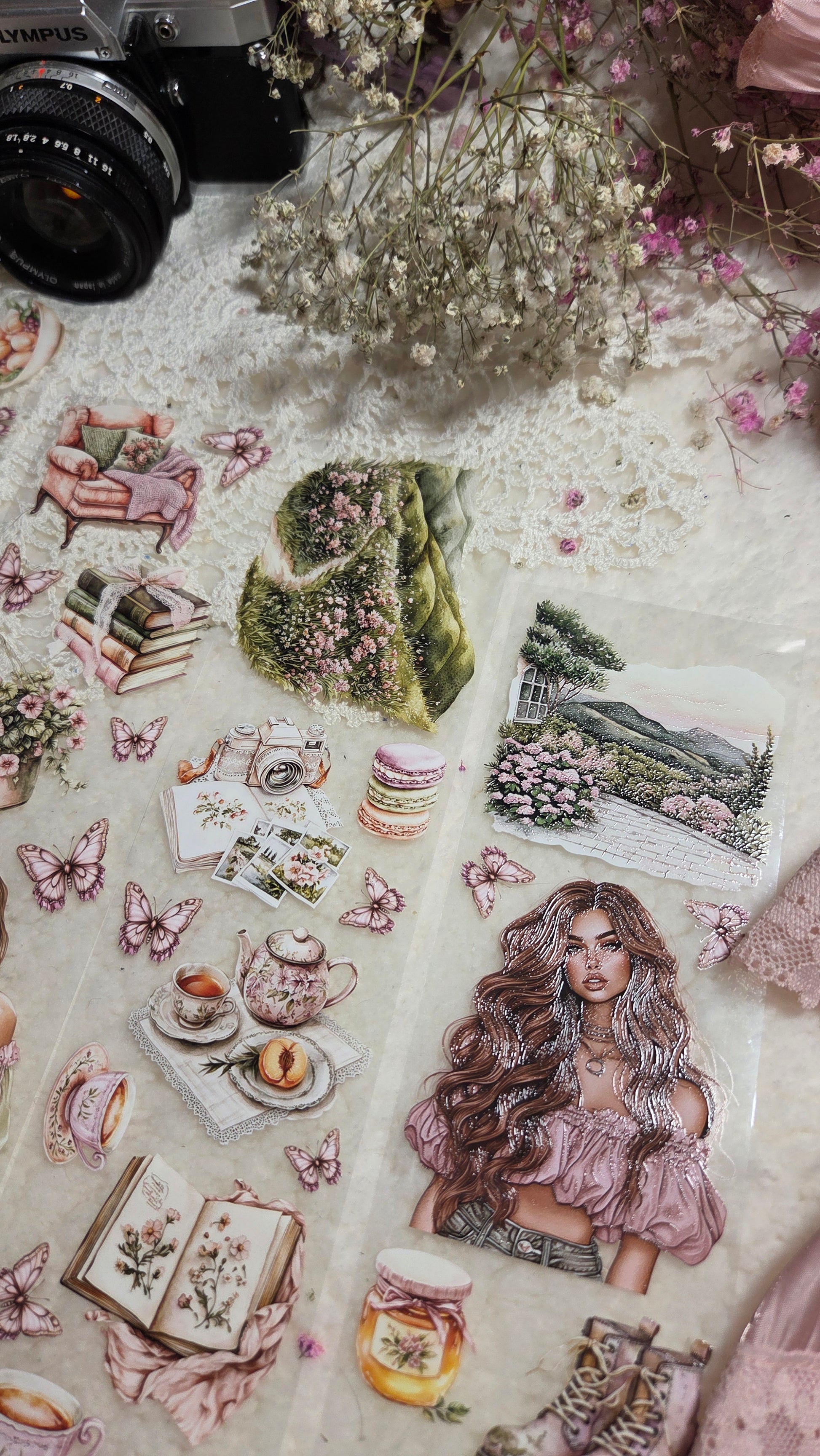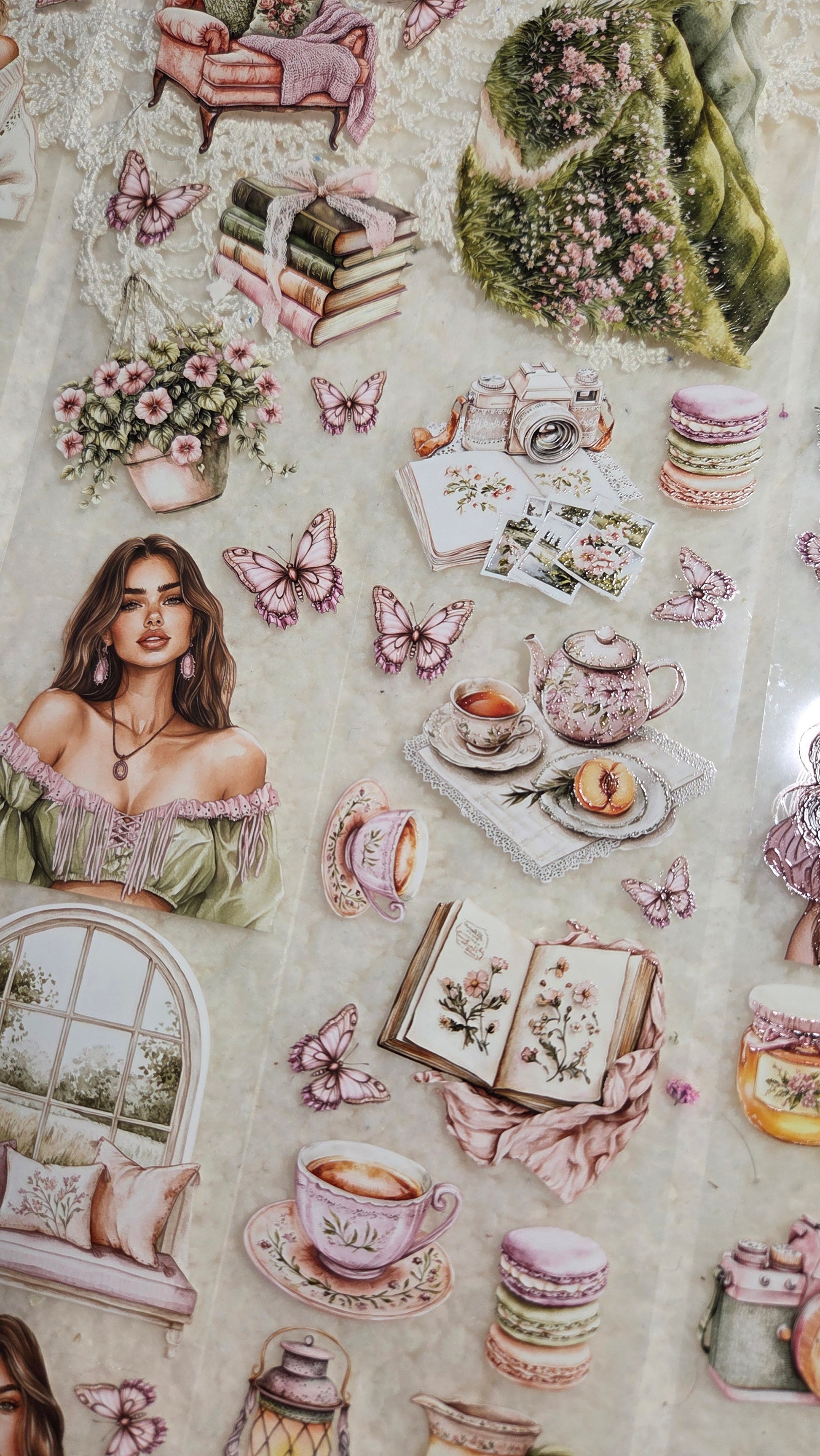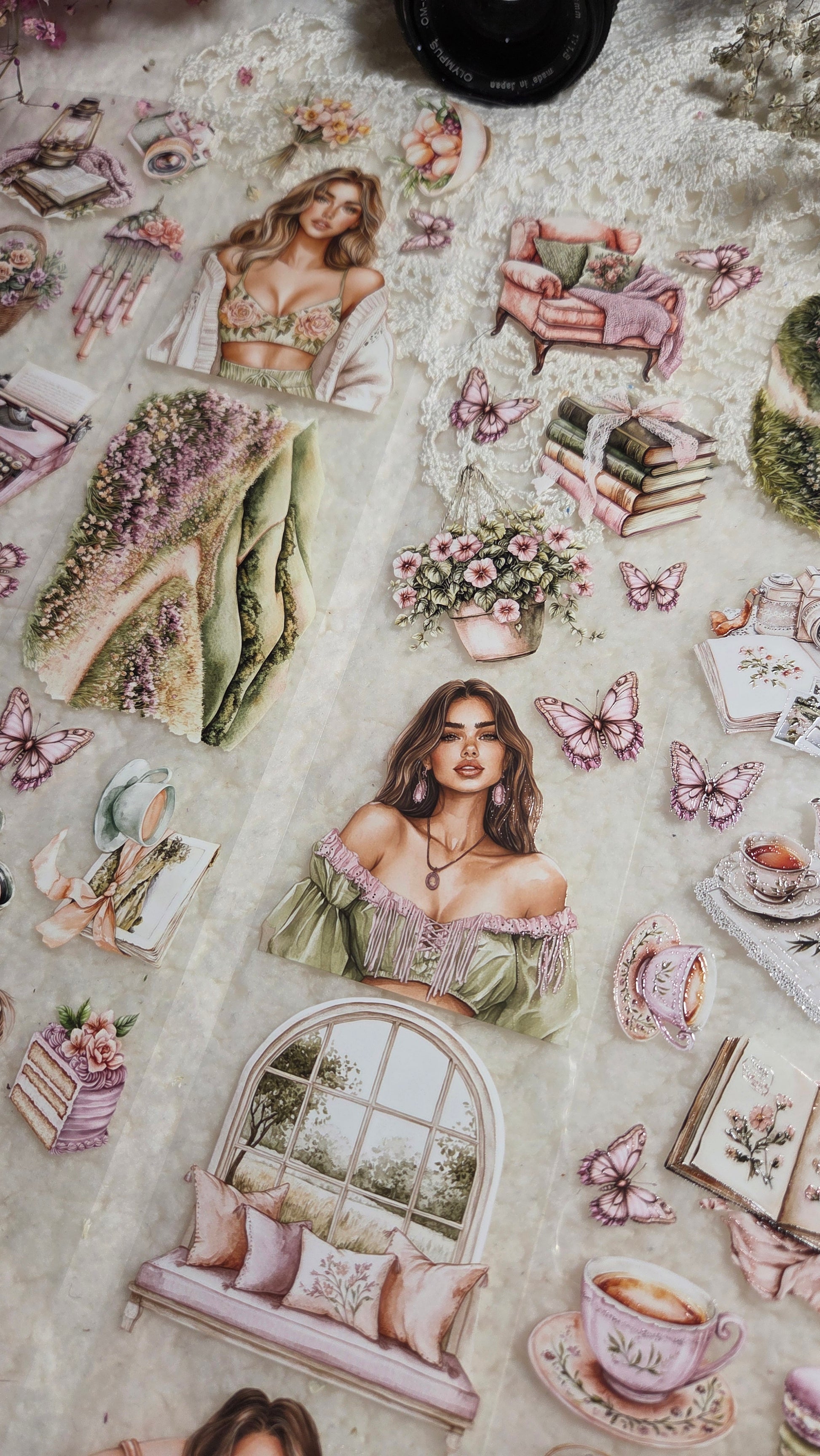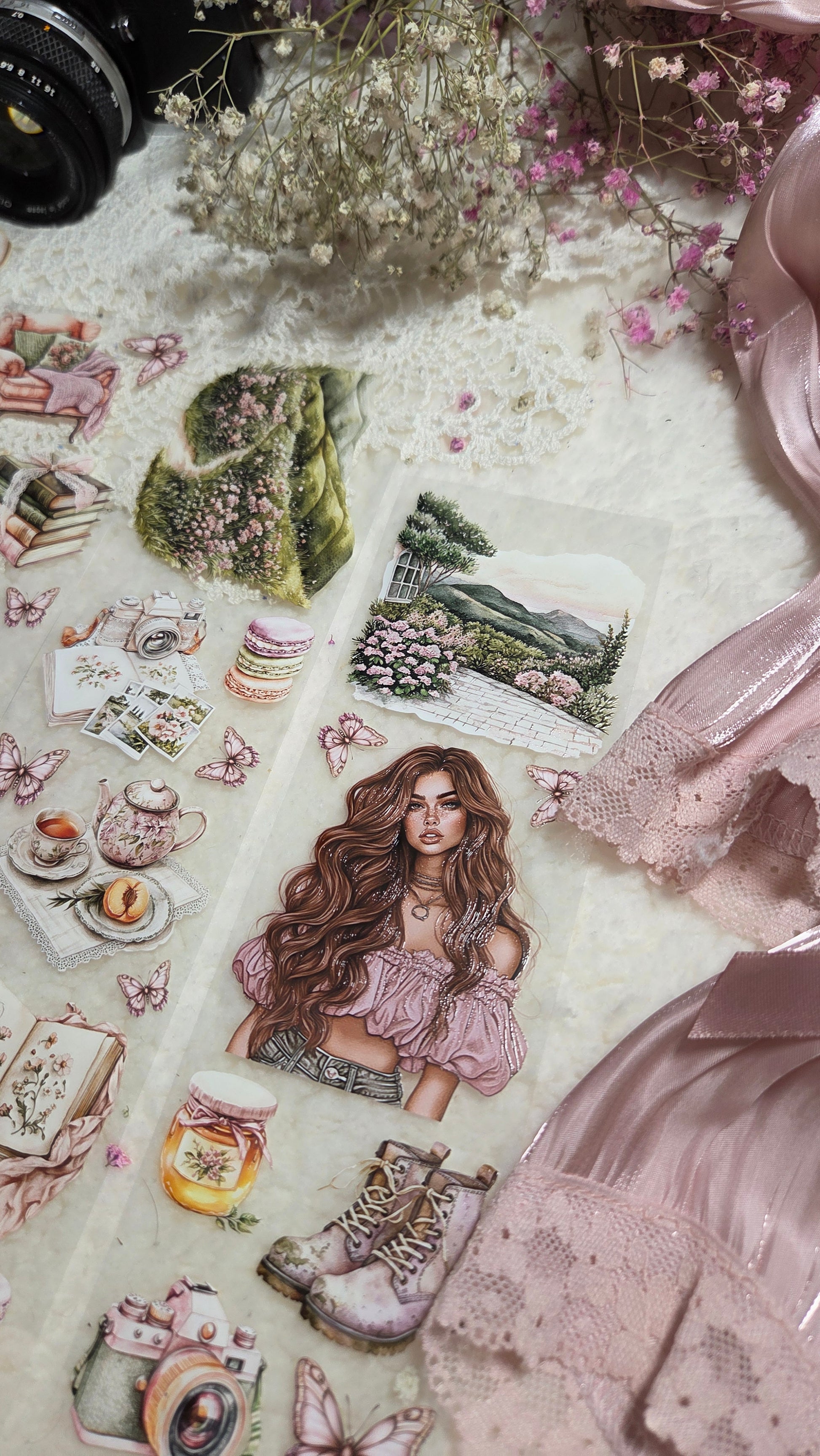 My decorated PET tapes are perfect for journaling but can be used in scrapbooking and other creative projects with extra glue support (glue tape for example). Made from high-quality clear or matte PET material, these tapes feature stunning illustrations created using AI technology (aven bought clipart), with crystal ink designs that add elegance and sparkle to any page. These tapes are a versatile tool to elevate your DIY crafts with ease and style.