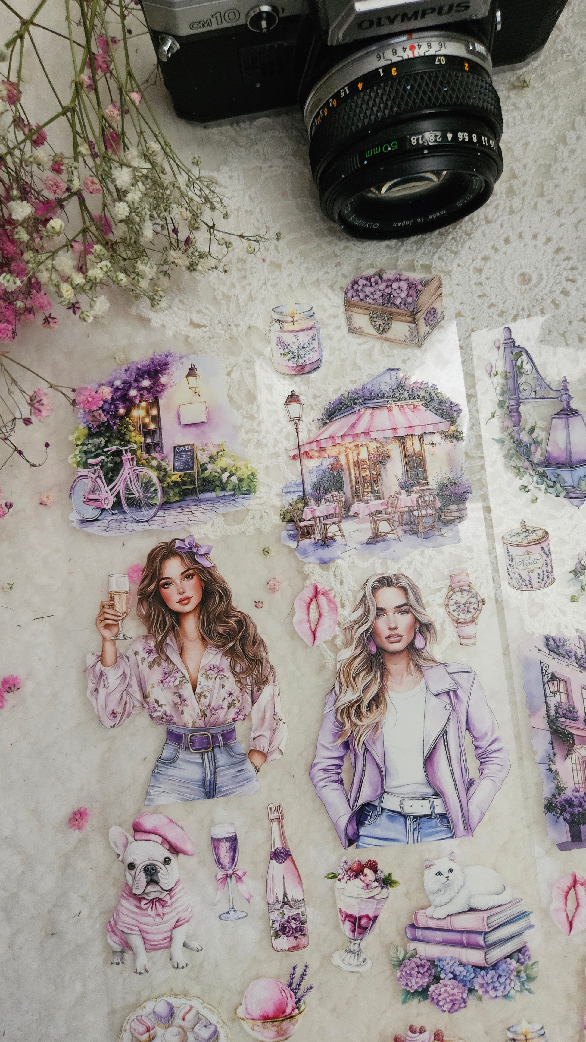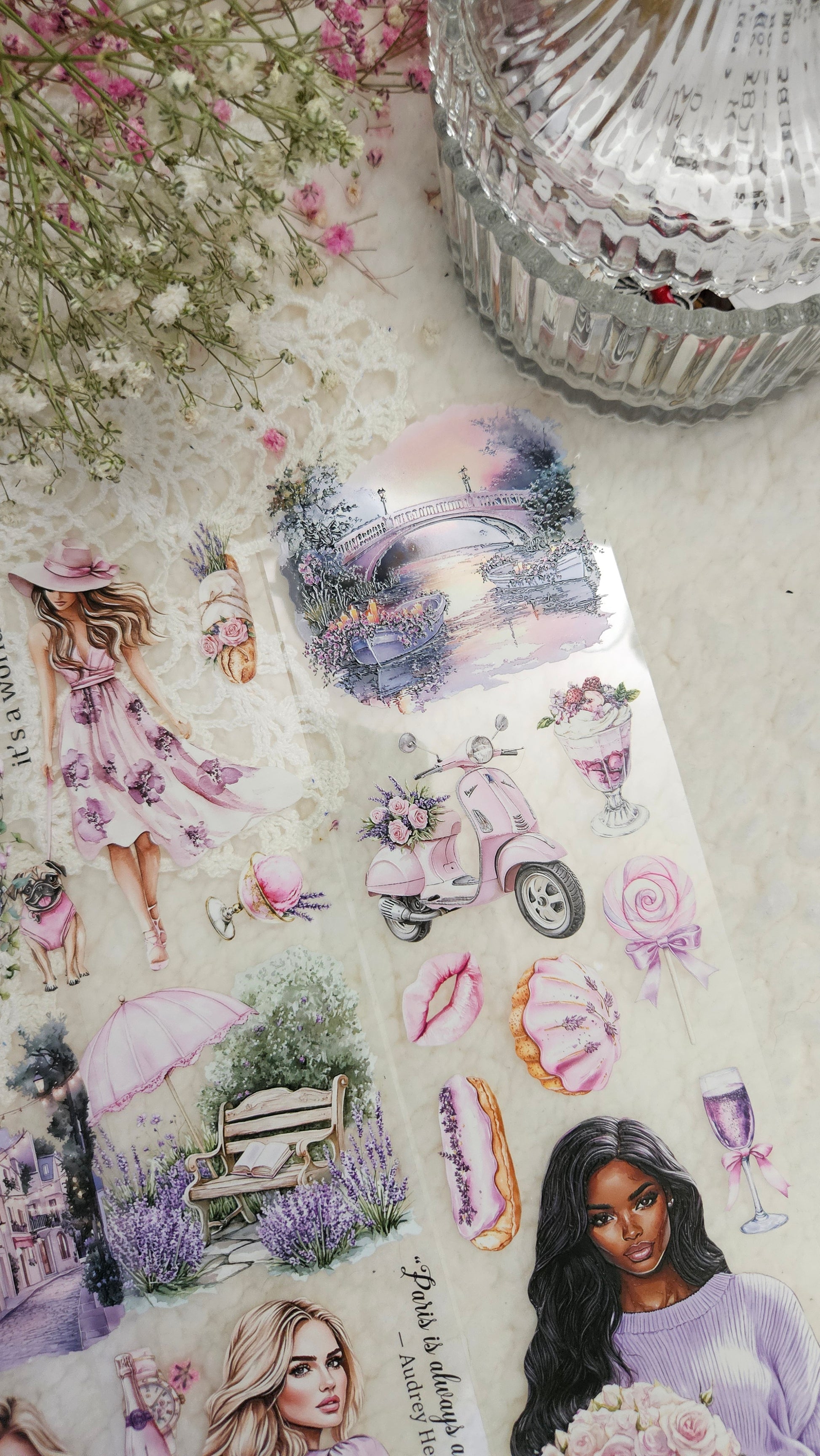 My decorated PET tapes are perfect for journaling but can be used in scrapbooking and other creative projects with extra glue support (glue tape for example). Made from high-quality clear or matte PET material, these tapes feature stunning illustrations created using AI technology (aven bought clipart), with crystal ink designs that add elegance and sparkle to any page. These tapes are a versatile tool to elevate your DIY crafts with ease and style.