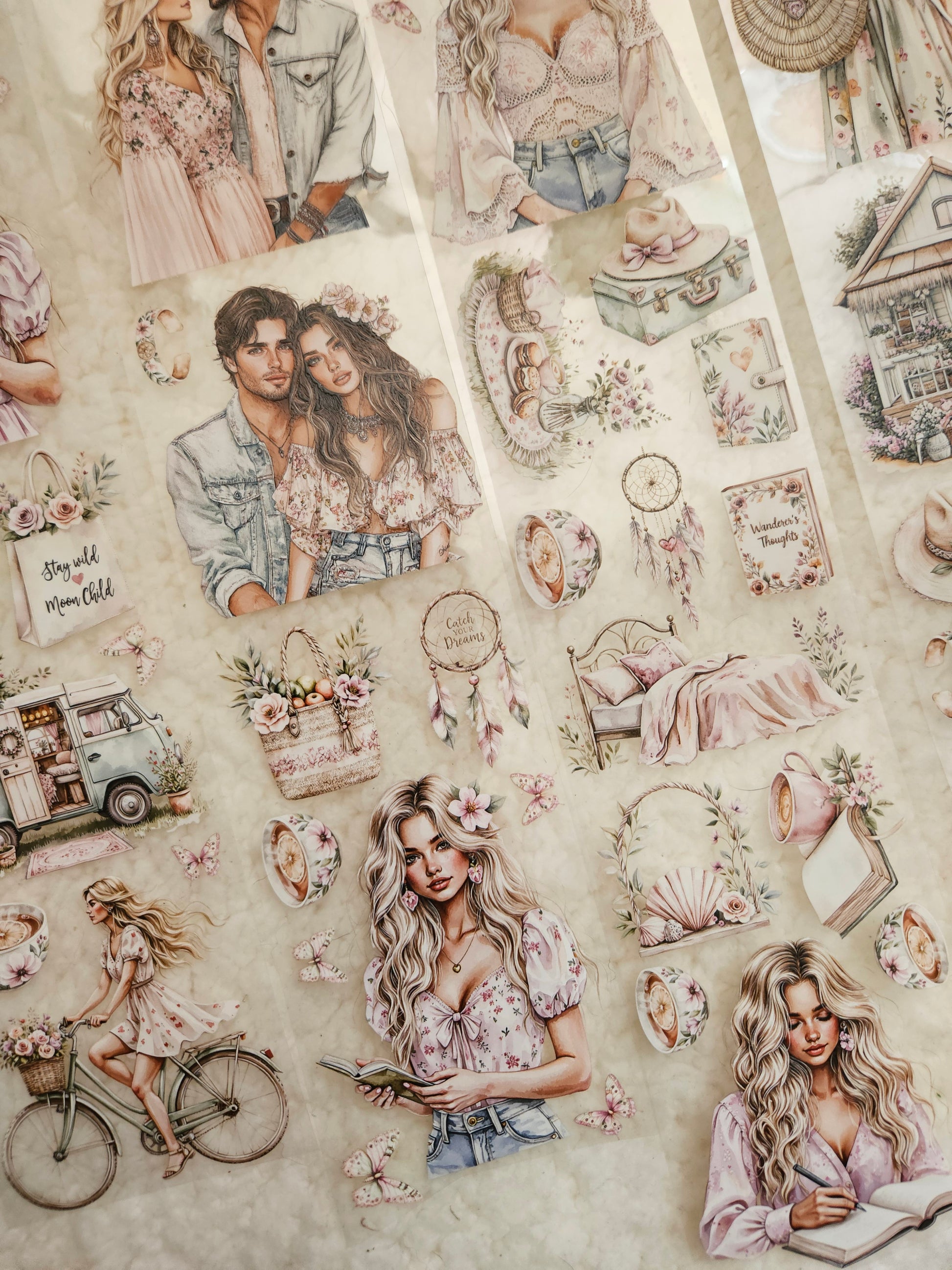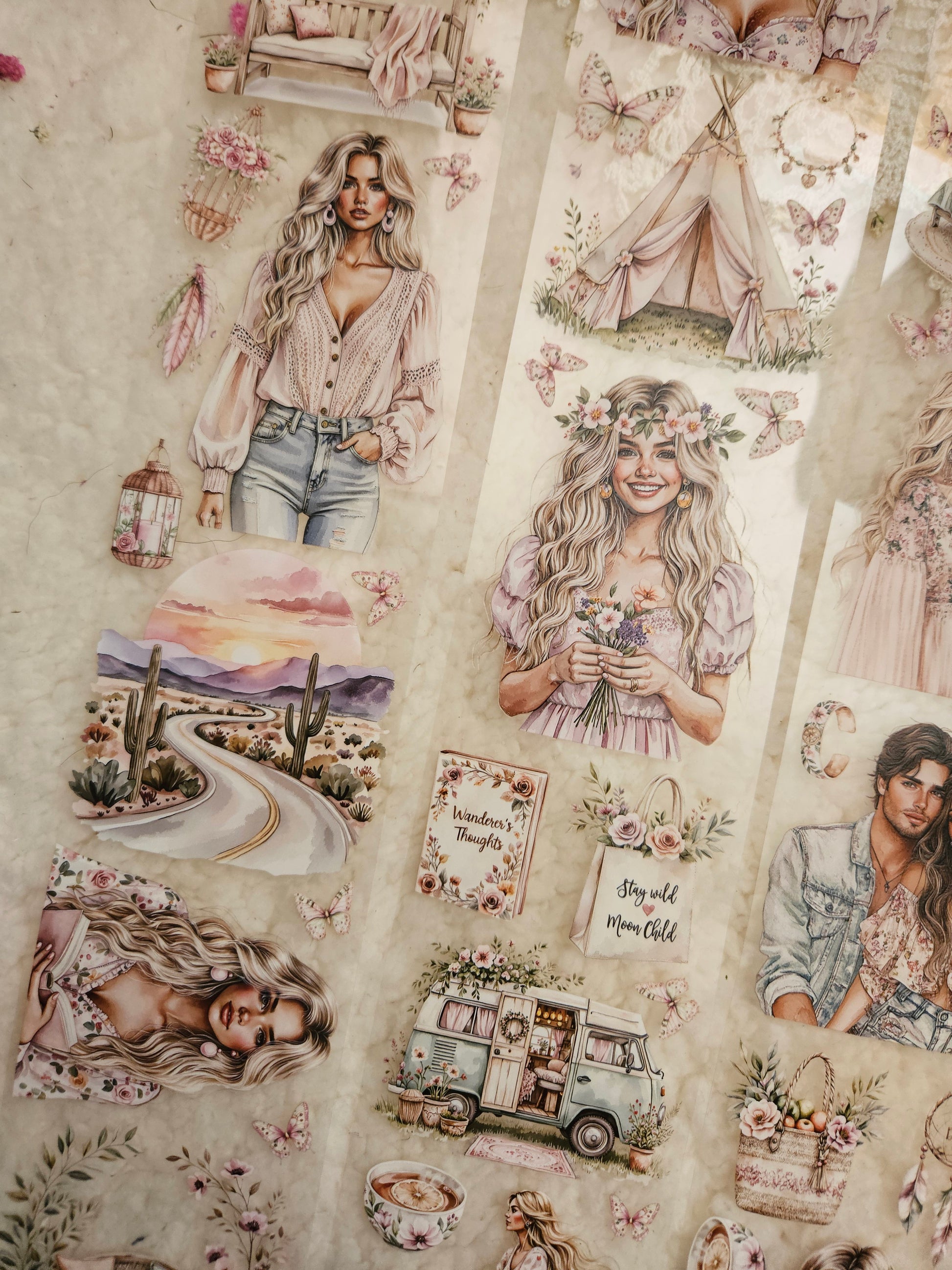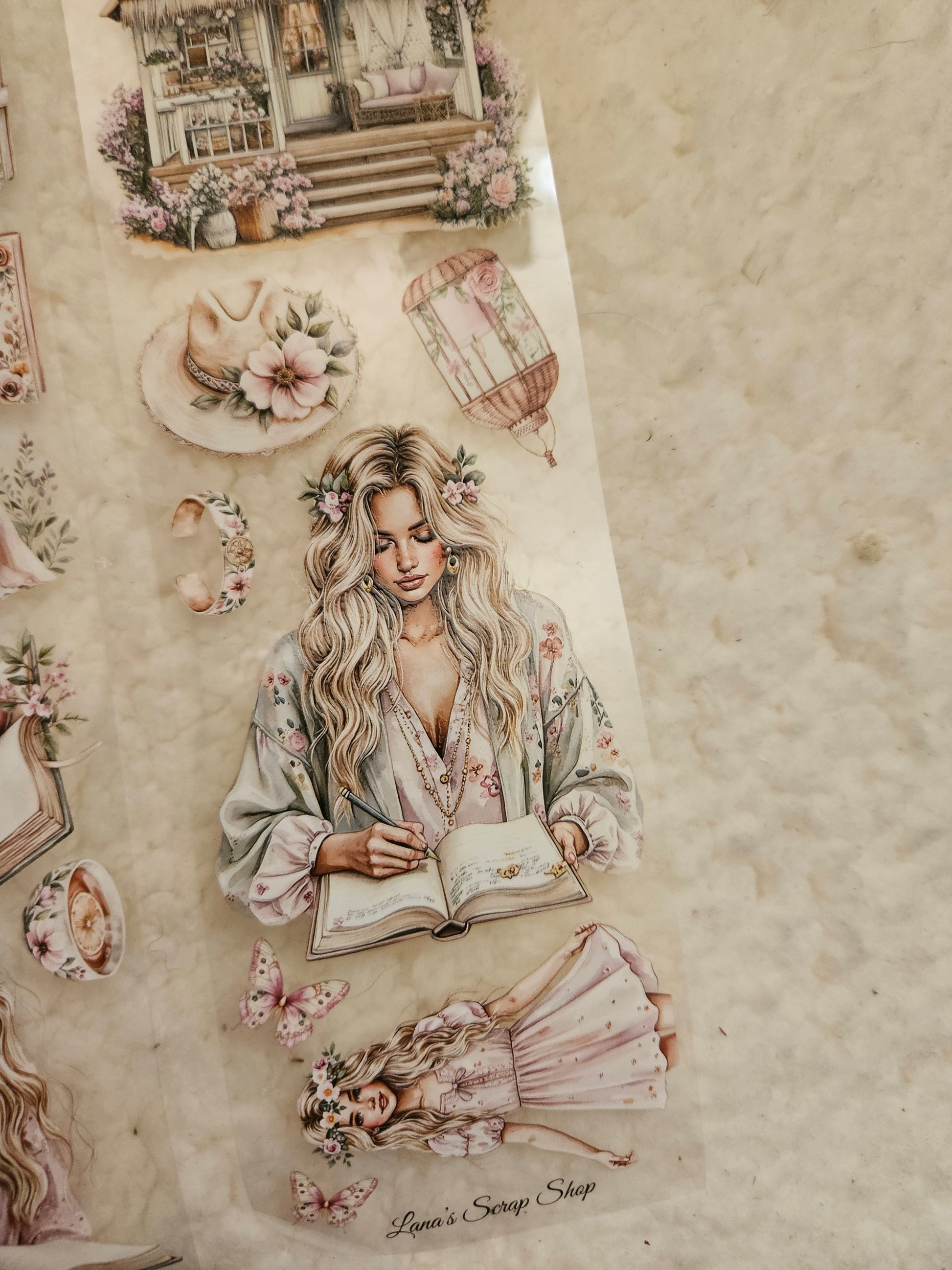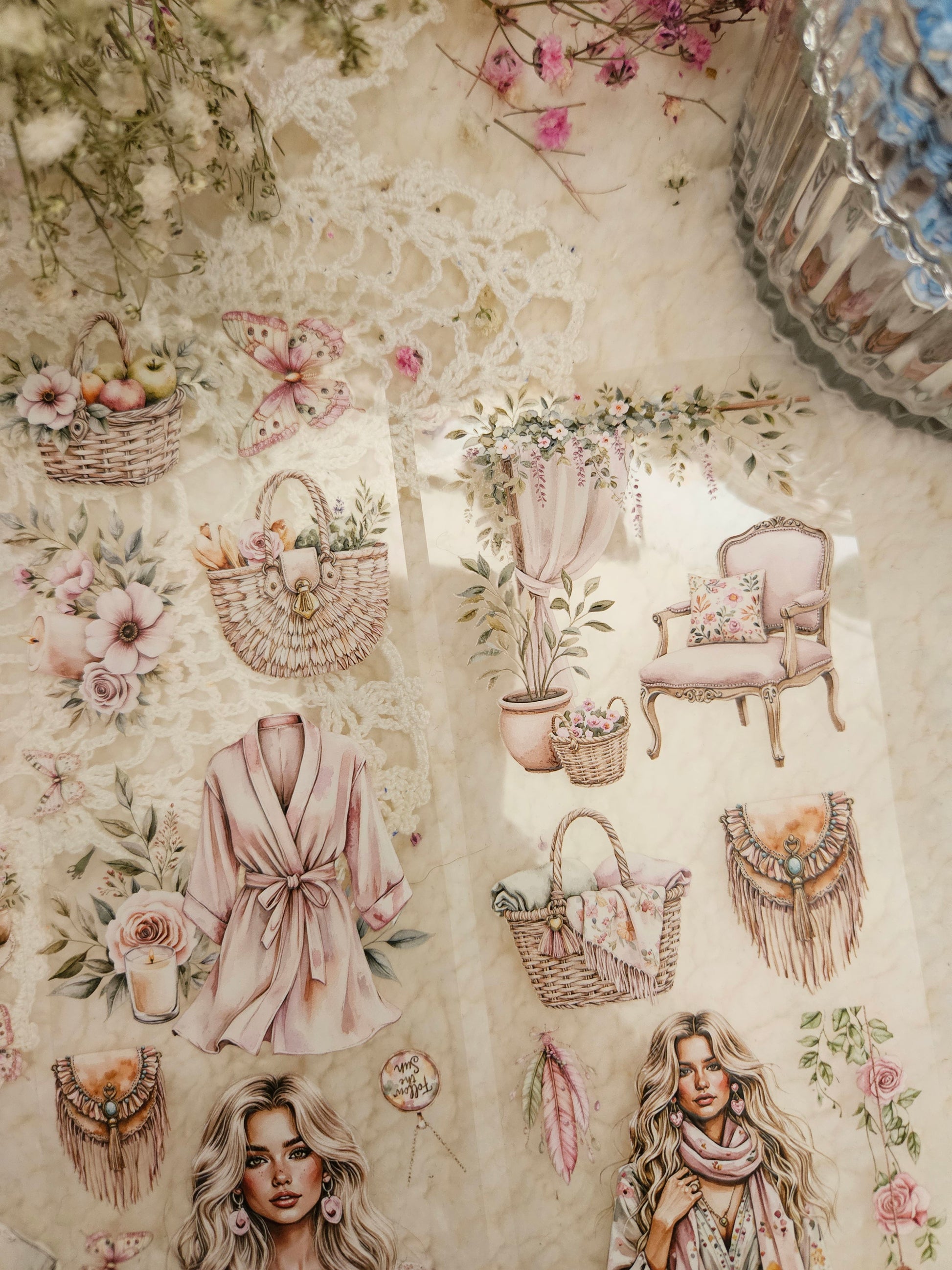 My decorated PET tapes are perfect for journaling but can be used in scrapbooking and other creative projects with extra glue support (glue tape for example). Made from high-quality clear or matte PET material, these tapes feature stunning illustrations created using AI technology (aven bought clipart), with crystal ink designs that add elegance and sparkle to any page. These tapes are a versatile tool to elevate your DIY crafts with ease and style.